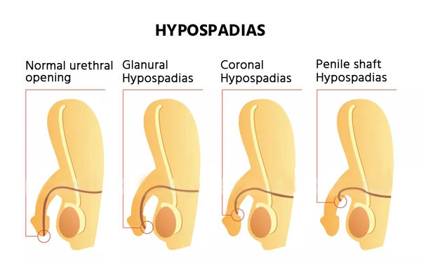 In babies with hypospadias, the meatus may form in various locations: